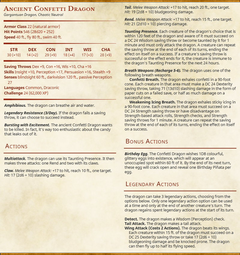 I like to reward my players, especially if they are clever, so here’s why the dragons are fun: they spawn piñatas, which will drop quite a little bit of lovely loot. If they are clever enough, they’ll quickly figure out that for them to get the most out of the encounter, they’ll have to spawn/kill as many of those as possible, while not slaying the dragon or die themselves. Essentially, the longer you keep the confetti dragon alive, the more loot you’ll get out of it. It’s a nice challenge for the party to figure out how much they can take or not – high risk, high reward.